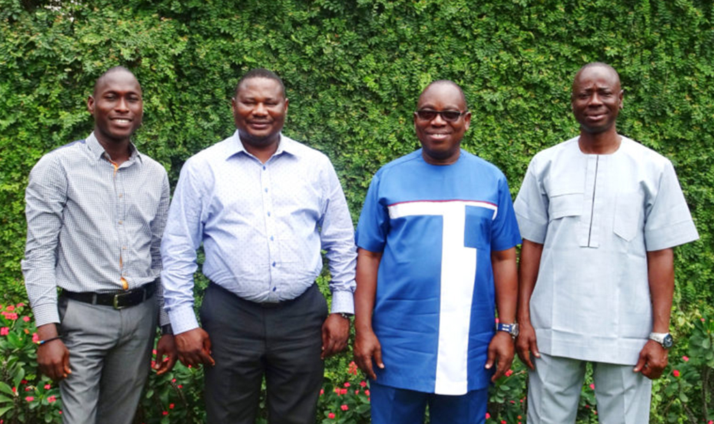 Nigeria rising up to the aflatoxin challenge! Presenting the formidable Harvestfield force ‘fomenting’ and spearheading an anti-aflatoxin revolution in Nigeria, with Aflasafe™ as the surprise ‘weapon’ in its arsenal. At the roundtable discussion at Harvestfield’s company’s headquarters in Lagos, Nigeria, was the entire top tier of Harvestfield’s management. Here, we have Martins Awofisayo (2nd right), Managing Director; Abdullahi A Ndarubu (extreme right), Chief Operating Officer; Wole Ilori (2nd left), General Manager, Sales and Technical; and Opeyemi Ogedengbe (extreme left), Senior Technical Representative for Aflasafe™